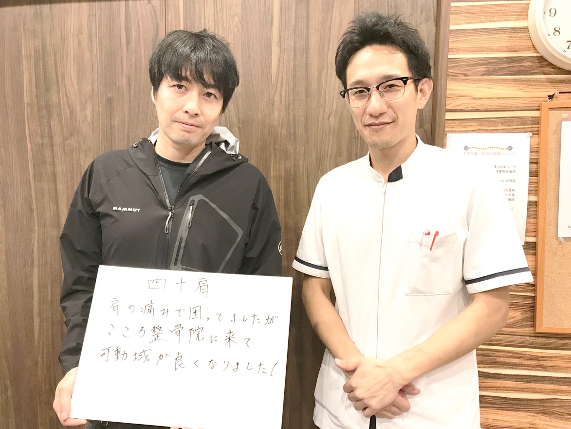 四十肩でした。 肩の痛みで困ってましたが、こころ整体院に来て、可動域が良くなりました。 ※効果には個人差があります |